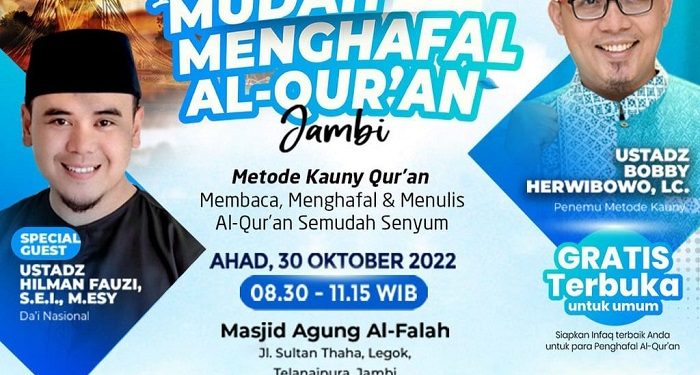 Sahabat Quran yang ingin bertemu langsung dengan Usbob dan Ustadz Hilman dapat hadir di Masjid Agung Al-Falah Jambi, pada pukul 08.30 – 11.15 WIB, Minggu (30/10/2022) mendatang.