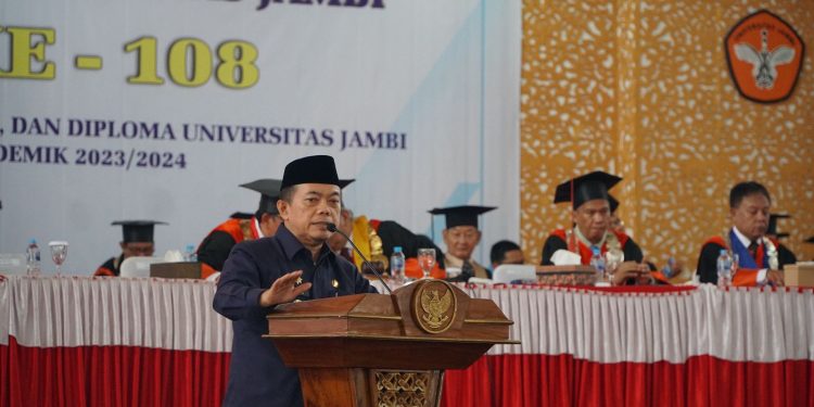 RAMNews.id, – Gubernur Jambi, Al Haris mengutarakan, prosesi wisuda ini merupakan salah satu fase bahagia didalam kehidupan. Hal tersebut diutarakannya saat menghadiri Rapat Terbuka Senat Universitas Jambi Wisuda Ke-108 Program Doktor, Magister, Profesi, Sarjana, dan Diploma Universitas Jambi Semester Genap Tahun Akademik 2023/2024, bertempat di Balairung Universitas Jambi, Mendalo Darat Kecamatan Jambi Luar Kota, Kabupaten Muaro Jambi, Selasa (27/02/2024) Pagi.